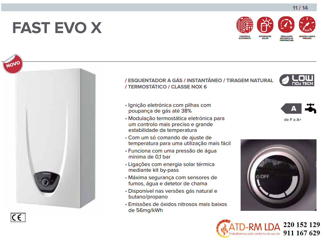 FAST EVO X é o novo esquentador a gás instantâneo de Low NOx, o utilizador consegue sempre a temperatura desejada mesmo que varie o caudal. Isto é possível graças a sonda NTC e a modulação do queimador, que garantem uma temperatura constante. Além disso, por ser um esquentador termostático evita o desperdício de água e de gás desnecessários ao ajustar-se perfeitamente a temperatura desejada.
